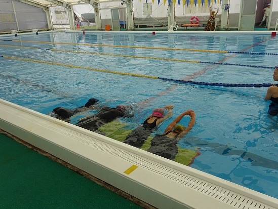 | B&G海洋センタープールにおいて、女性限定の水中ウォーキング教室が開催されました。 アクアポールを使ったり、腕を組み水流をおこして歩きました。 |