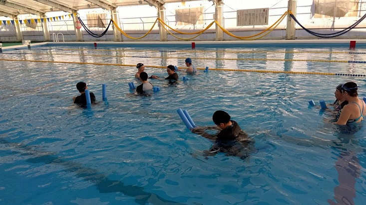 | B&G海洋センタープールにおいて、女性限定の水中ウォーキング教室が開催されました。 アクアポールを使ったり、腕を組み水流をおこして歩きました。 |