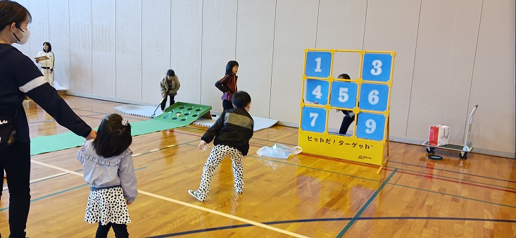 | 28名の参加があり、卓球・バドミントン・屋内モルック・ストラックアウト・パットゴルフ・ダンボールつみつみのコーナーの