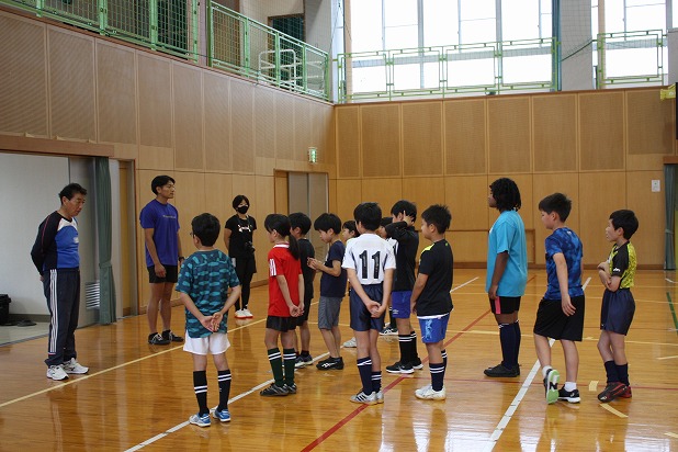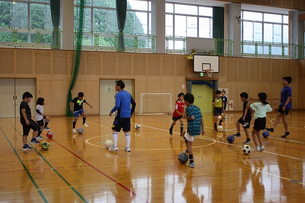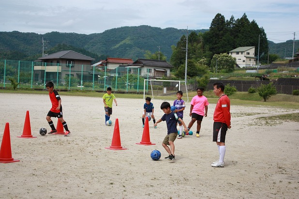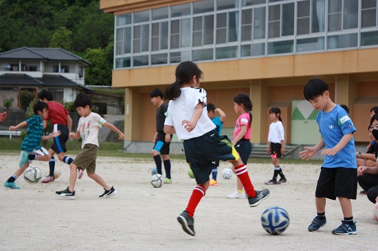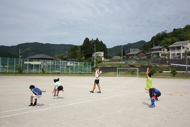 | 美和町だけでなく本郷・錦の小学生も参加してくれました。 最初に、裸足になって足裏の感覚をつかむ練習方法や、ゴムチューブを使ってスタートの姿勢を教えてもらいました。 後半はサッカー体験があり、ミニゲームを楽しみました。 小川先生の楽しい教室で、笑顔いっぱいの子どもたちでした。 次回は6月15日(土)の予定です。 |